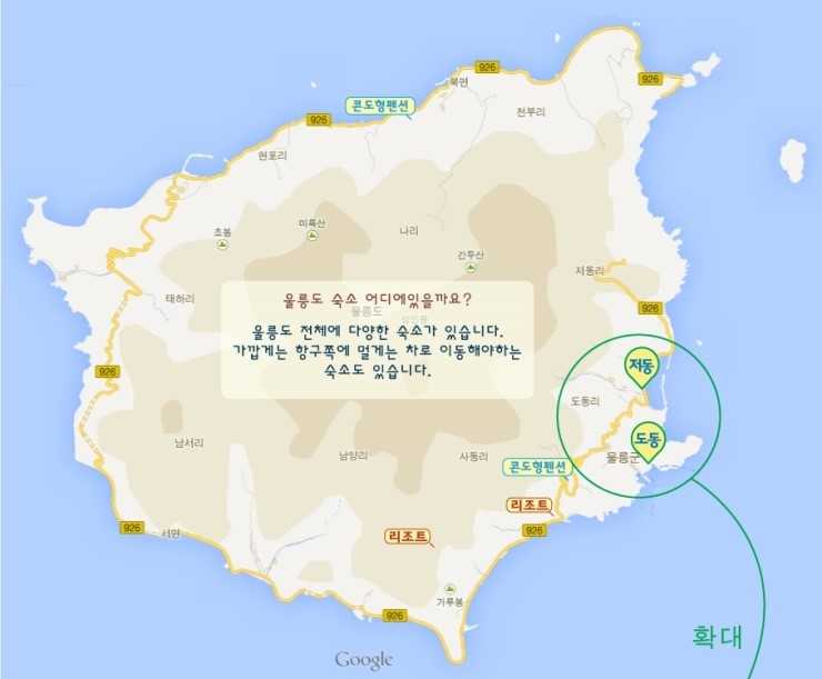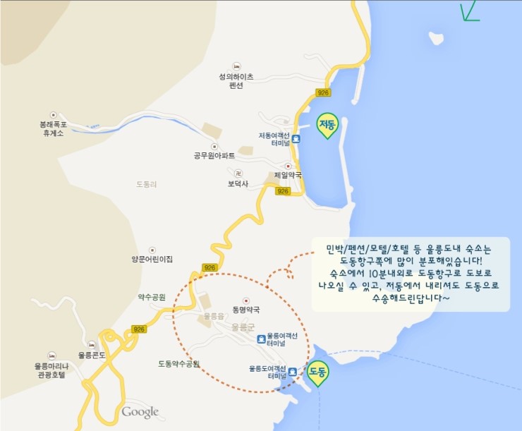 위에 지도에 도동항이 보이네요~ 저희도 숙박 이용할때 특별히 리조트나 콘도형펜션을 원하는 분들이 아니라면 도동쪽에 숙소로하고 있습니다. 패키지로 여행하시는 분들은 저동에서 내리셔도 숙소로 따로 오실 필요 없이 수송도 해드리니 거리가 있어도 불편함을 없으시겠죠~ 참고로! Q. 항구쪽 숙소안에서 바다를 볼 수 있나요~~~? 라고 물어보시는 분들이 간혹 계신대요~ 대부분 건물들이 자리하고 있기때문에 창을 통해서 바다를 보기는 조금 힘들답니다.ㅠ 대신에 숙소에서 나오셔서 조금만 걸어가면 바다 인근이니 시원한 바다 바람을 만끽할 수 있답니다 그래도 원하신다면 바다전망의 객실도 있고, 콘도형펜션이나 리조트 전망도 굉장히 좋답니다! 참고하시고 문의주시면 될 것같습니다~^^